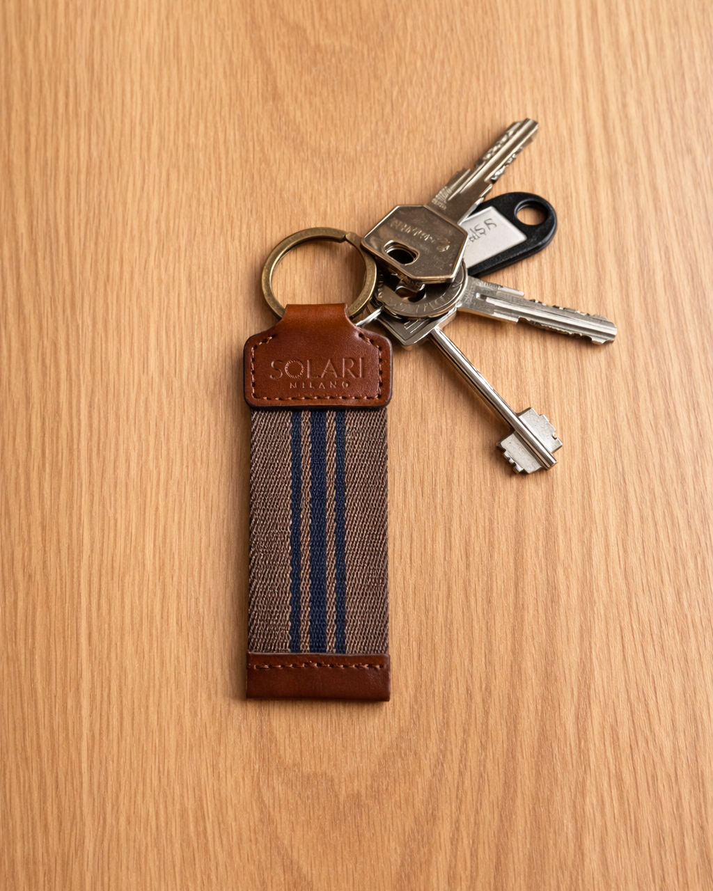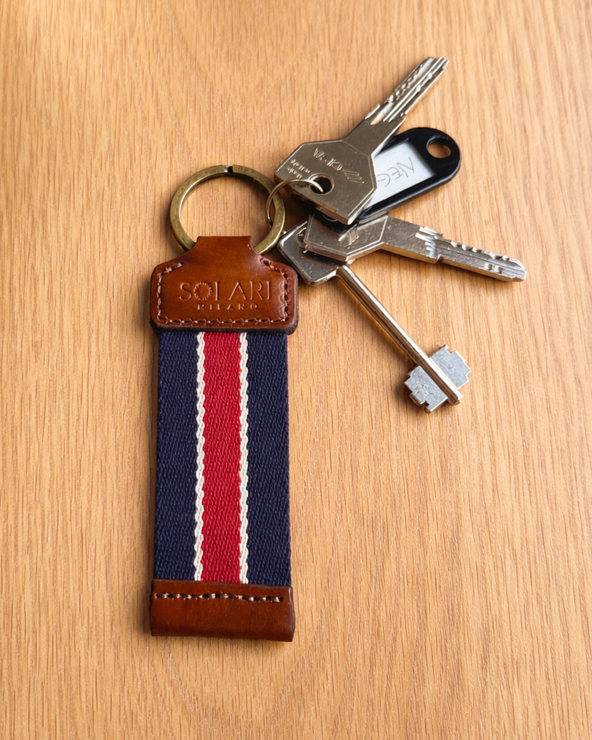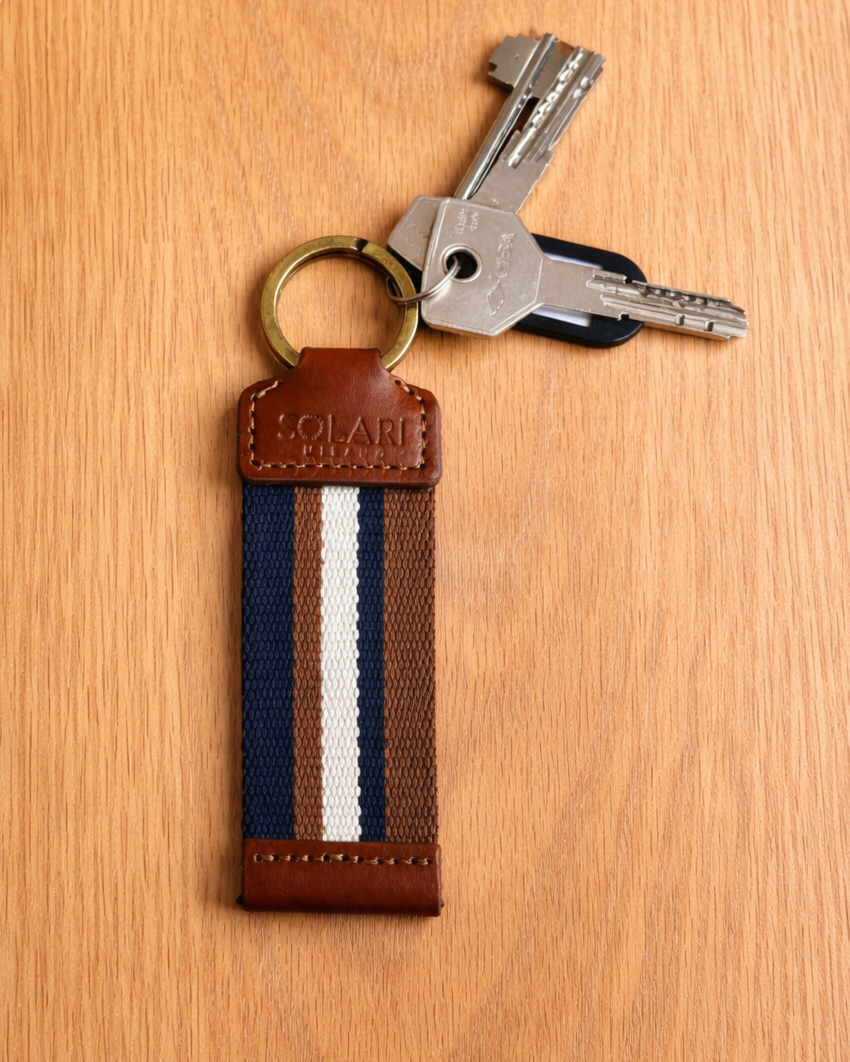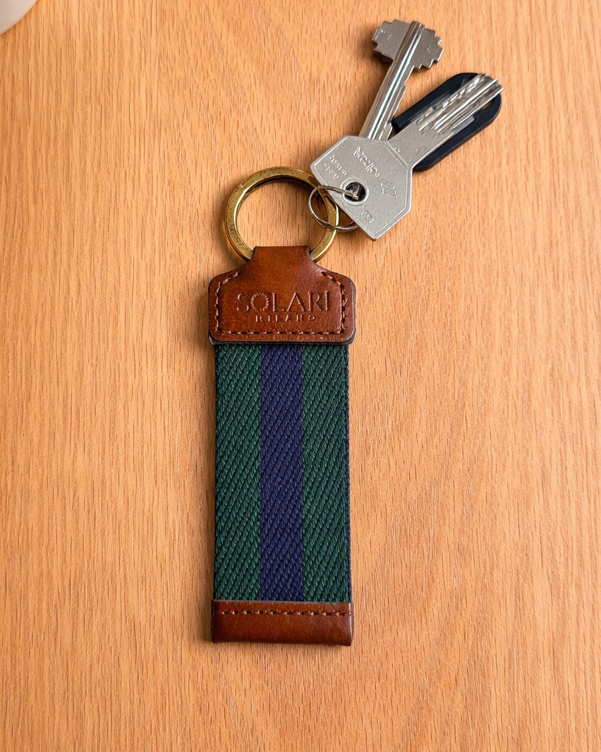 Fabriqué en Italie avec des matériaux de haute qualité, ce porte-clés associe un tissu acrylique durable à des détails en cuir végan raffiné. La sangle texturée et les combinaisons de couleurs intemporelles en font un accessoire polyvalent, parfait pour un usage quotidien tout en ajoutant une touche subtile de personnalité.